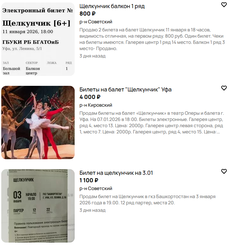 Согласно расписанию театра, следующие спектакли «Щелкунчика» состоятся с 7 по 11 января. Все билеты на эти даты уже проданы, однако на сайтах объявлений спекулянты предлагают их к перепродаже.