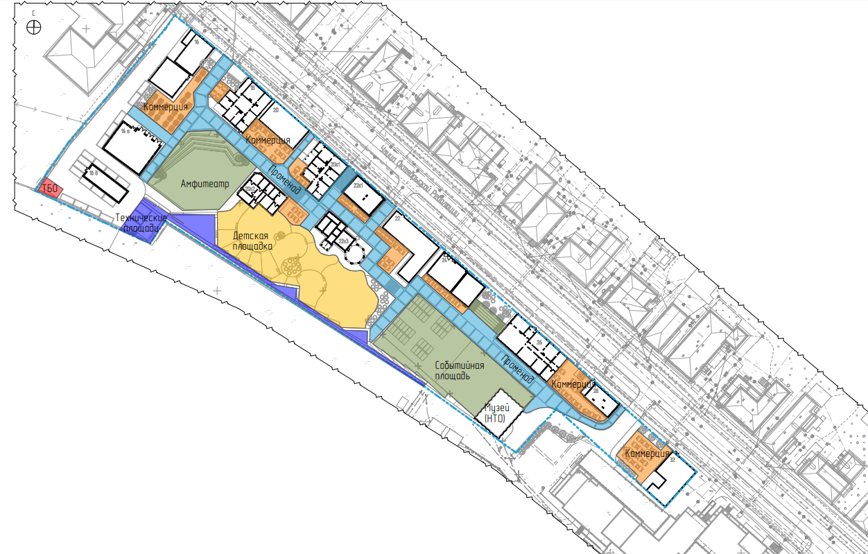 План благоустройства также предусматривает создание различных функциональных зон. На участке появятся прогулочная аллея, событийная площадь для проведения мероприятий, детская игровая площадка, амфитеатр и коммерческие помещения.