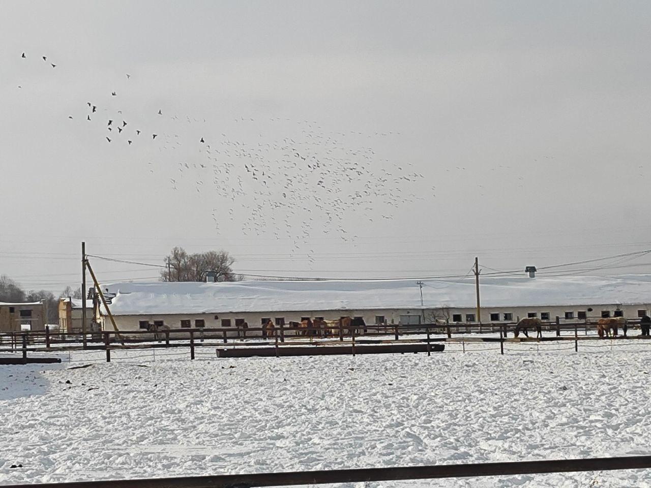 Над табунами постоянно кружат стаи птиц, вид которых сложно определить.