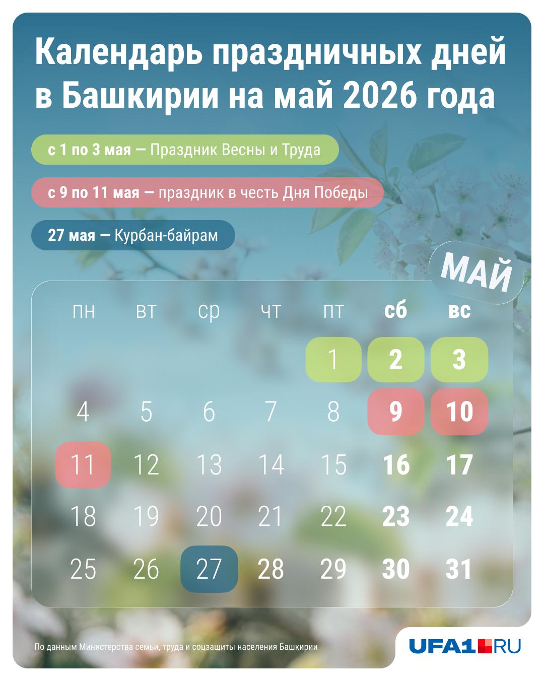 Следующий выходной — Курбан-байрам, который отмечается в среду, 27 мая. Этот день является официальным праздничным нерабочим днём на территории Башкортостана. Отметим, что это региональный выходной, действующий только в пределах республики.