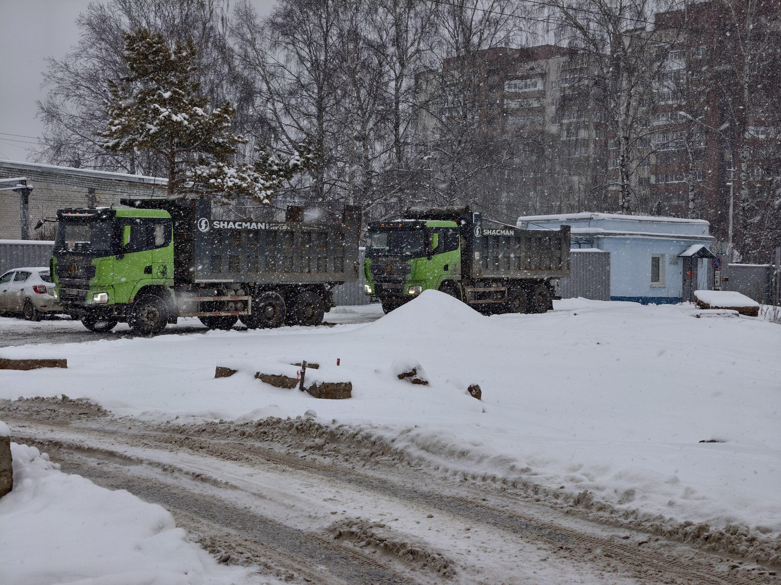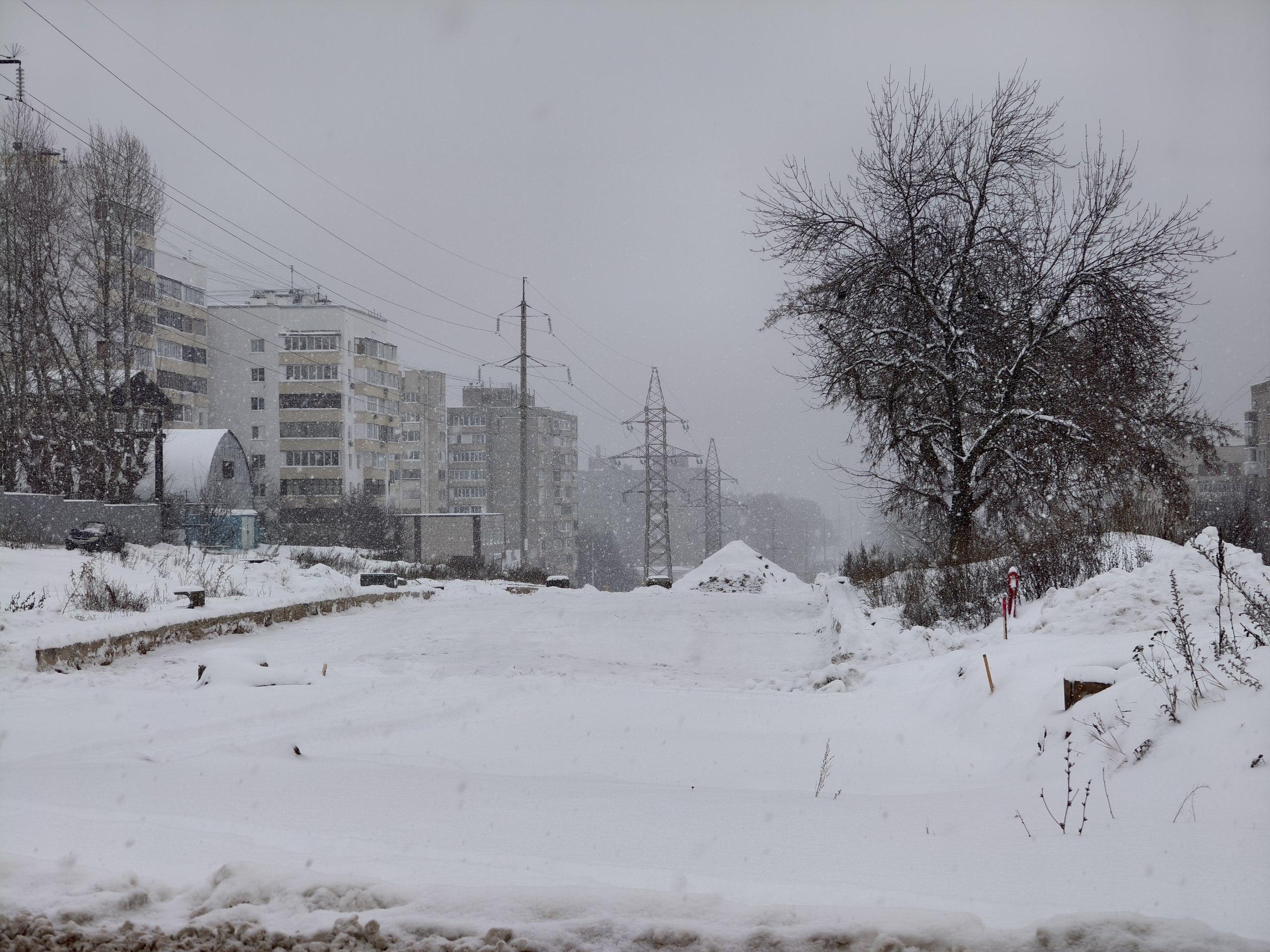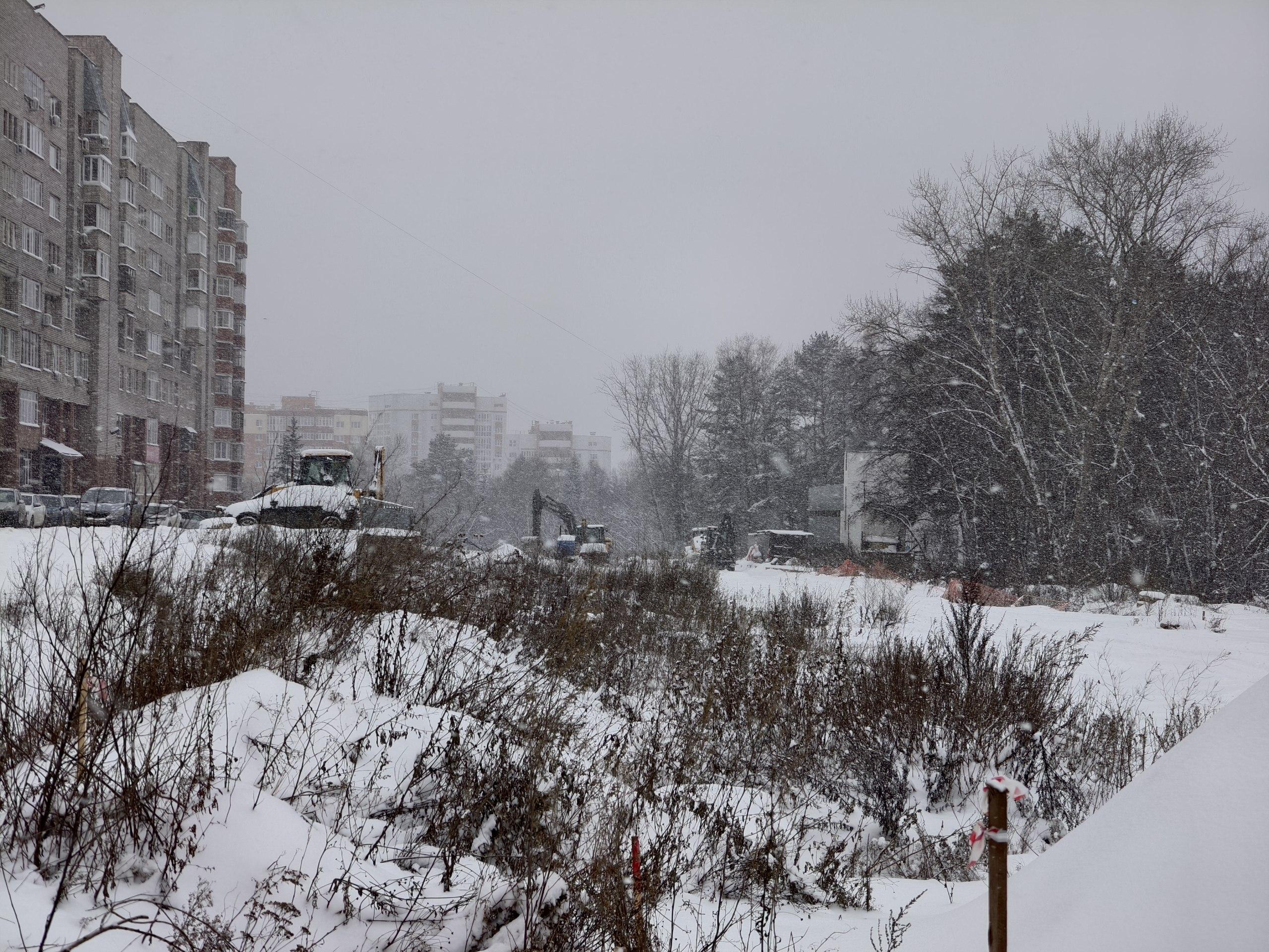 Строительная техника на улице Рабкоров, покрытая снегом, в ожидании весенних работ.
