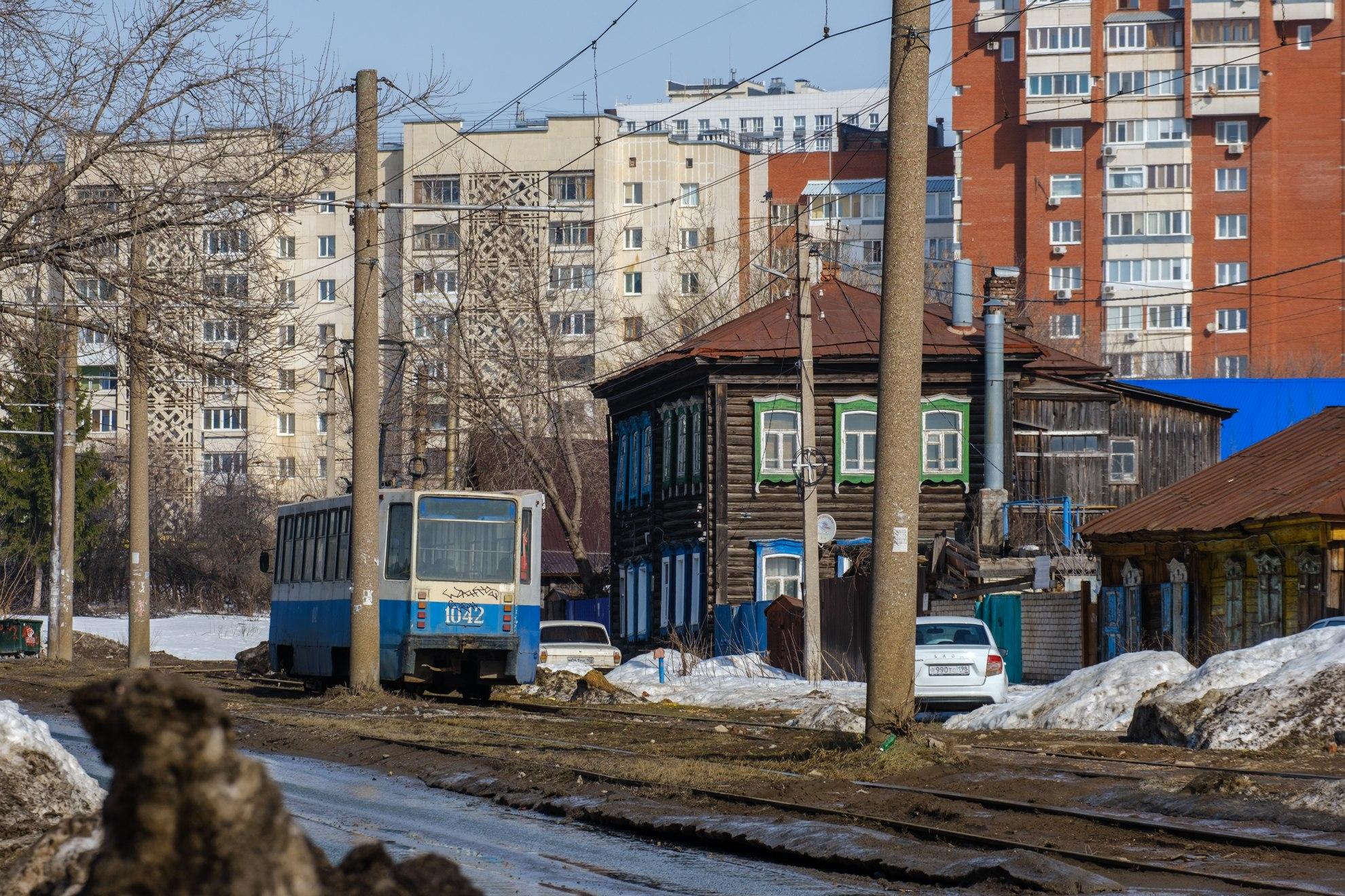 Улица Мингажева оборудована трамвайными путями, но дорожное покрытие здесь в плохом состоянии — повсюду грязь и слякоть.