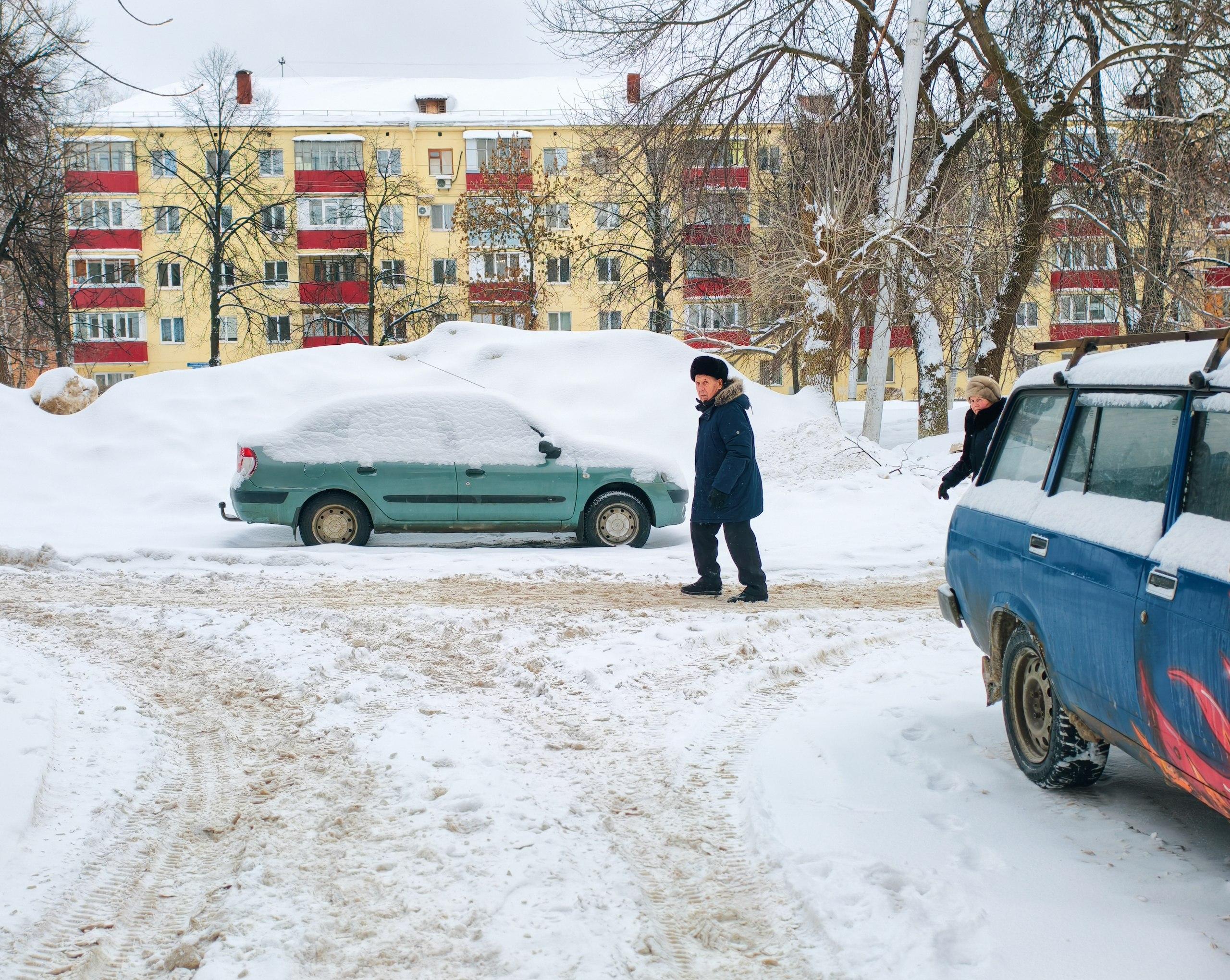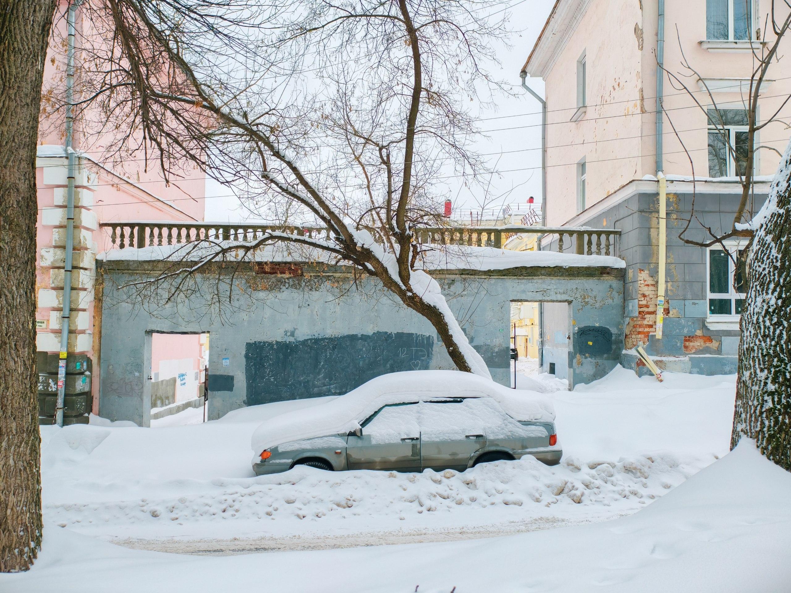 На улицах, например на Первомайской, дороги покрыты снегом. Во дворах автомобили частично засыпаны, а рядом лежат сугробы.
