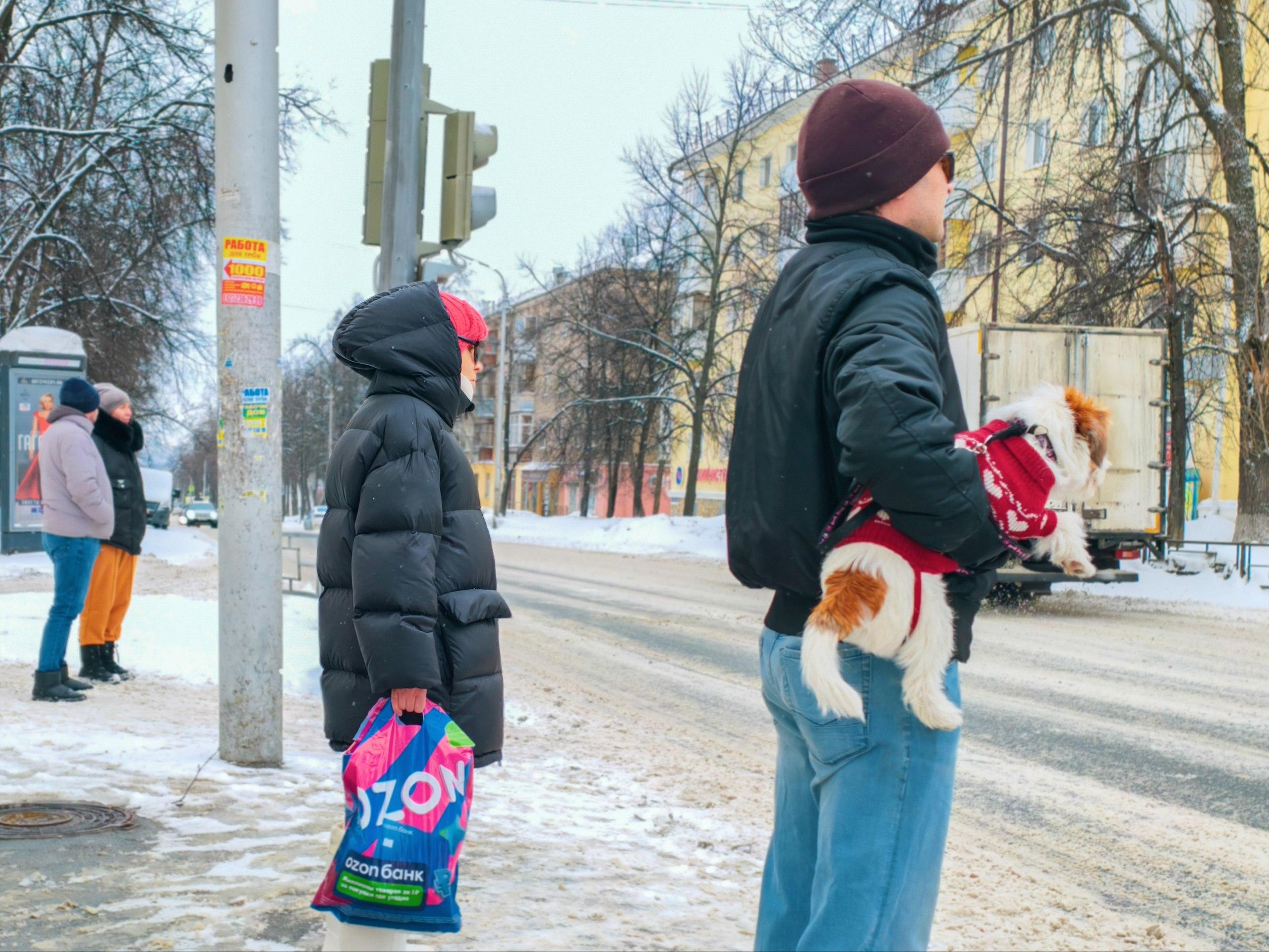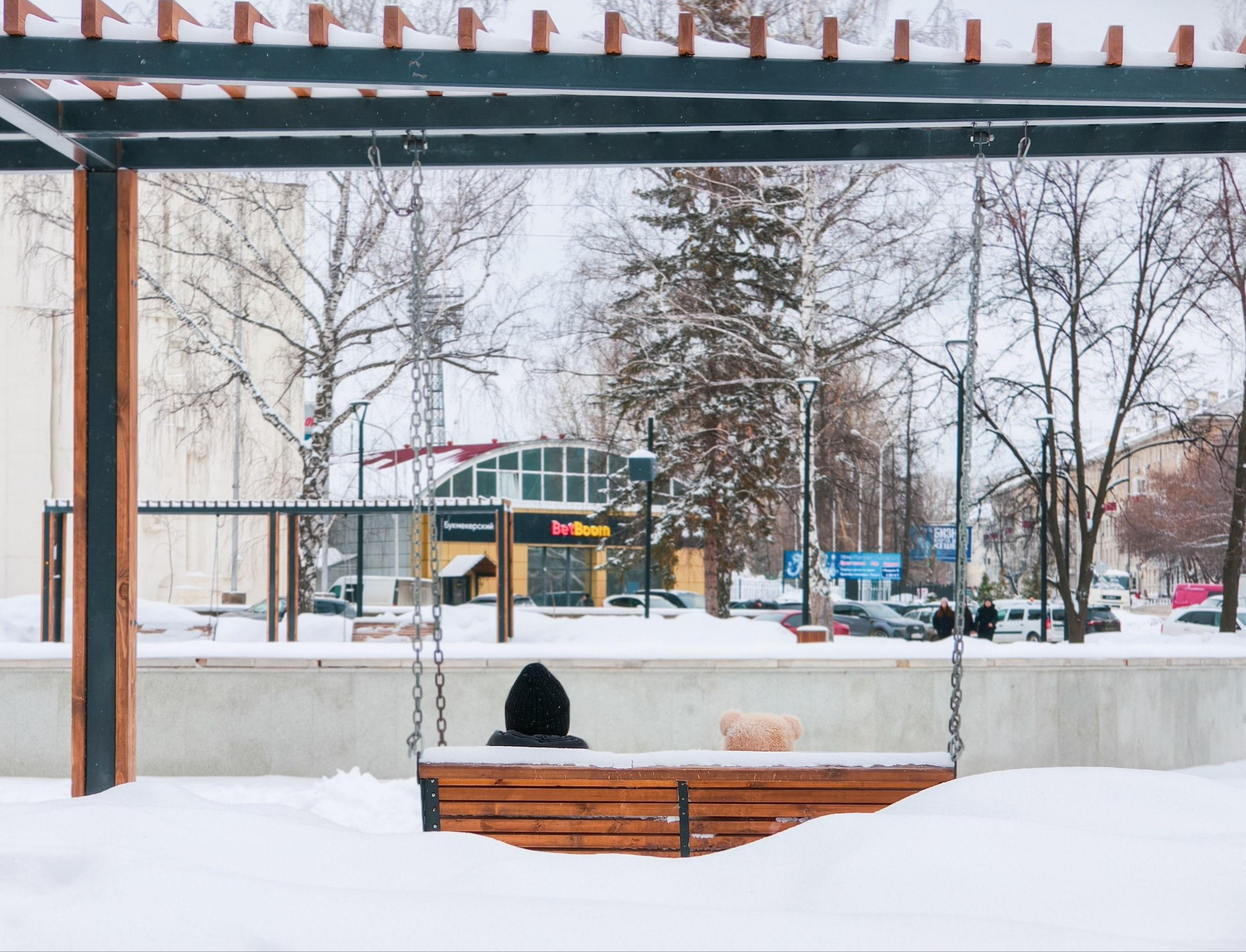 В районе Черниковки жители выходят на улицу в тёплой одежде, и даже домашние питомцы одеты по-зимнему. В одном из дворов кто-то разместил на качелях розового медведя.