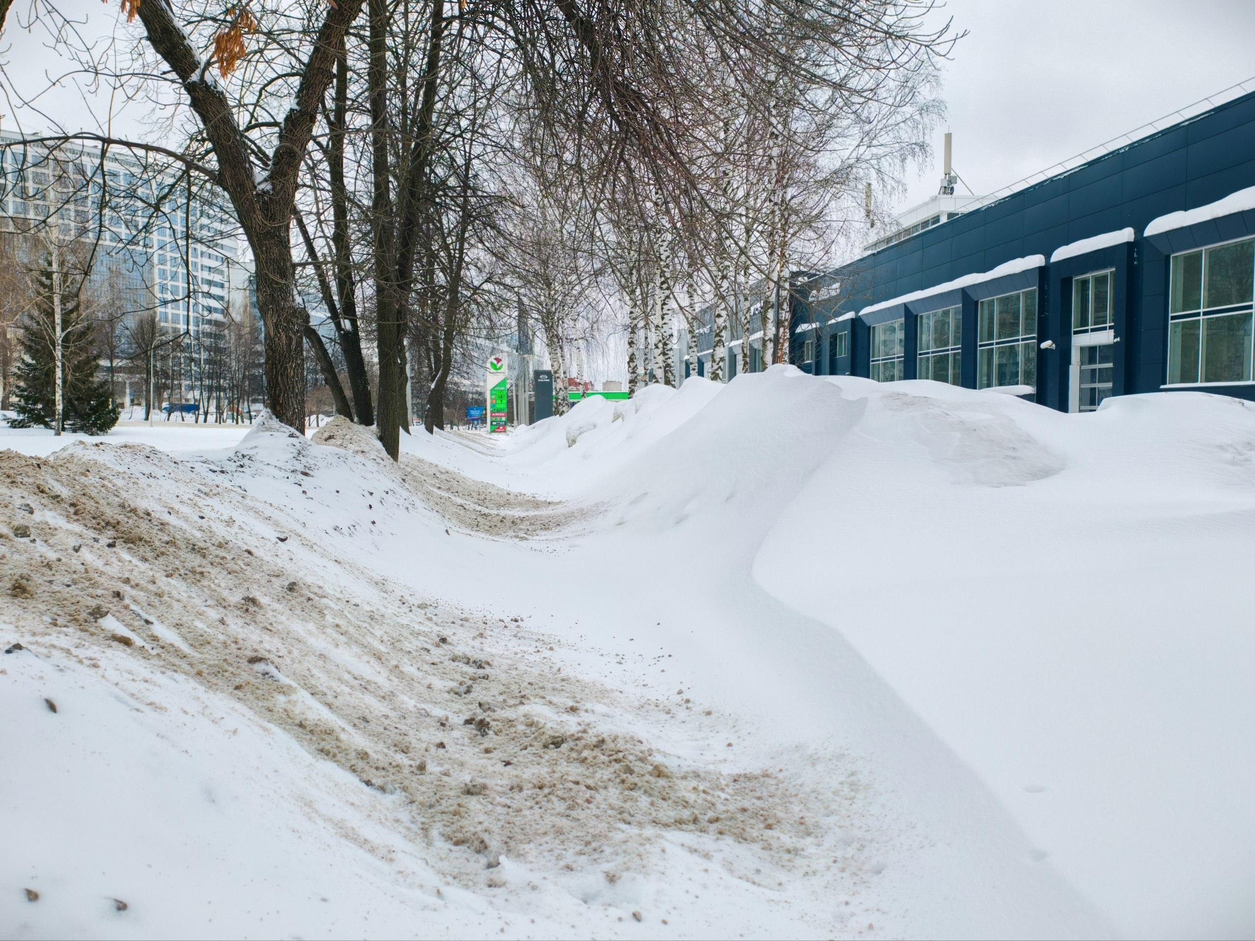 Тротуары, как на выезде из Черниковки возле автосалона, часто не расчищены. Однако основные дороги местами очищены техникой.
