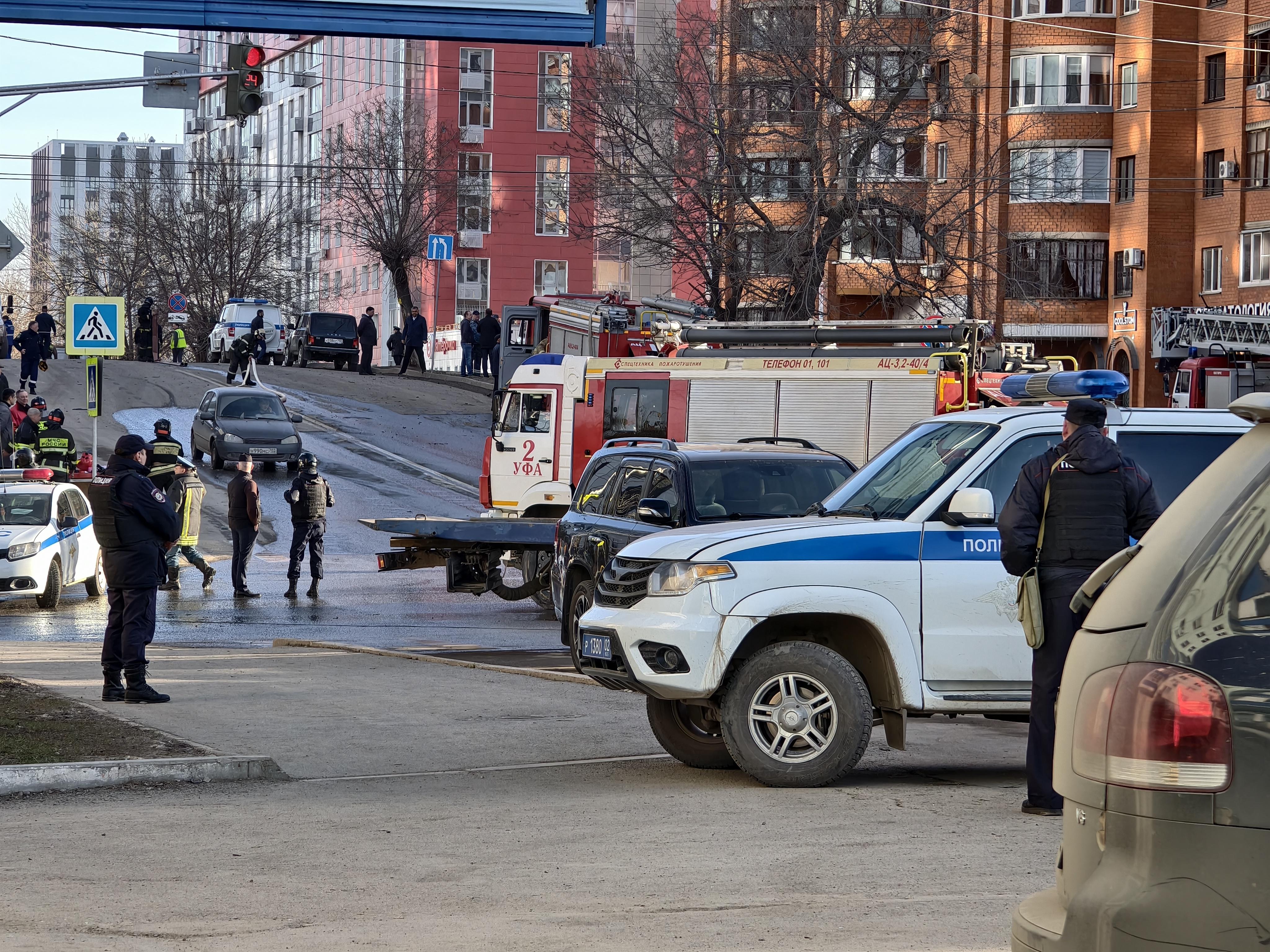 Беспилотник врезался в жилой дом на улице Гафури, что привело к временному ограничению движения. Пострадавших нет.