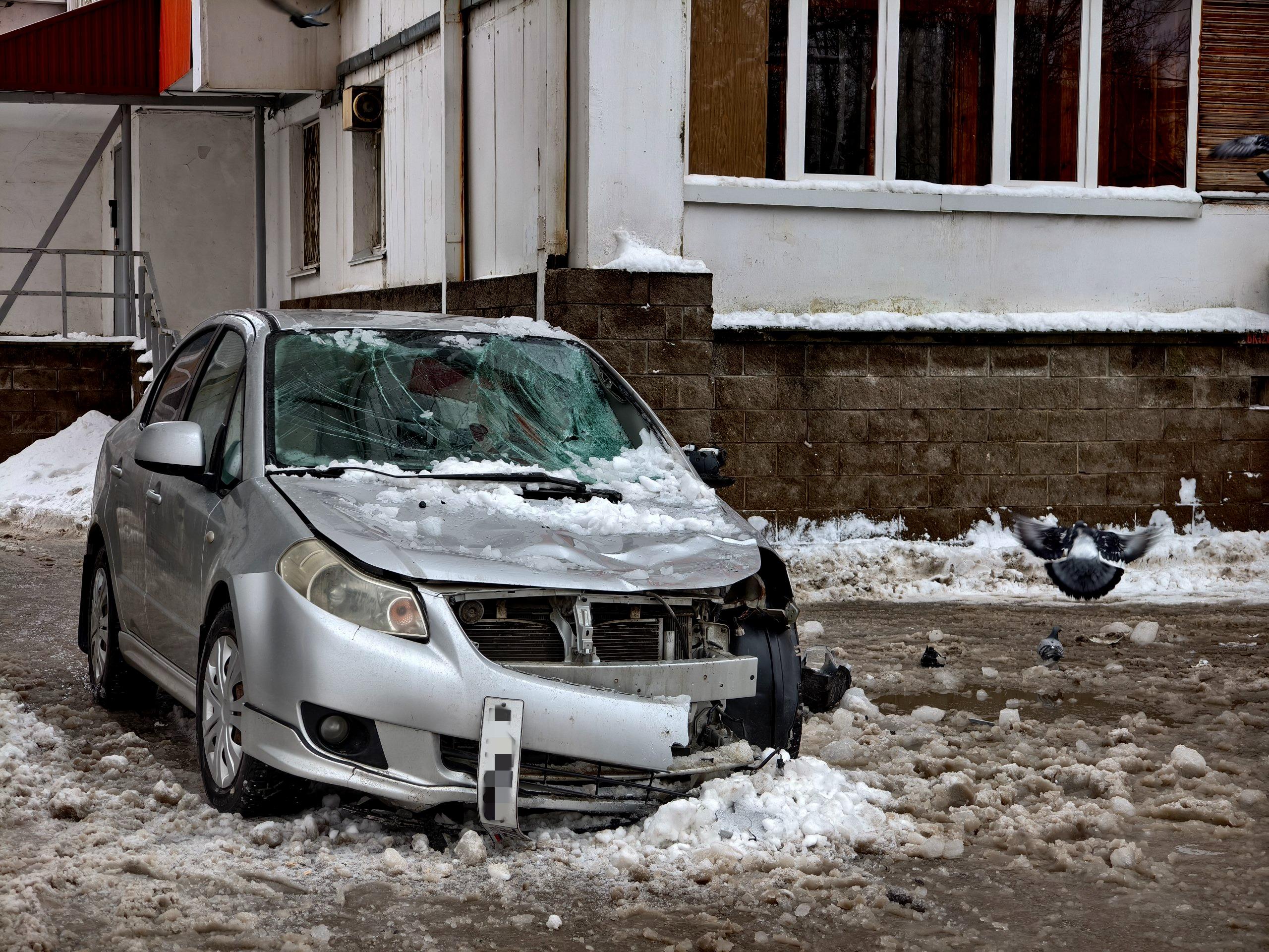 Снежная масса со льдом обрушилась на автомобиль, в котором находились женщина и её дочь. К счастью, люди не пострадали.