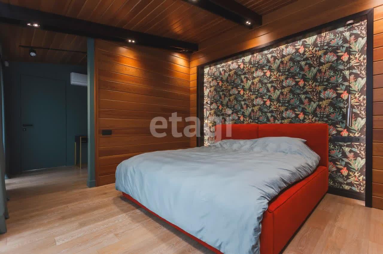 Спальня с деревянной отделкой стен