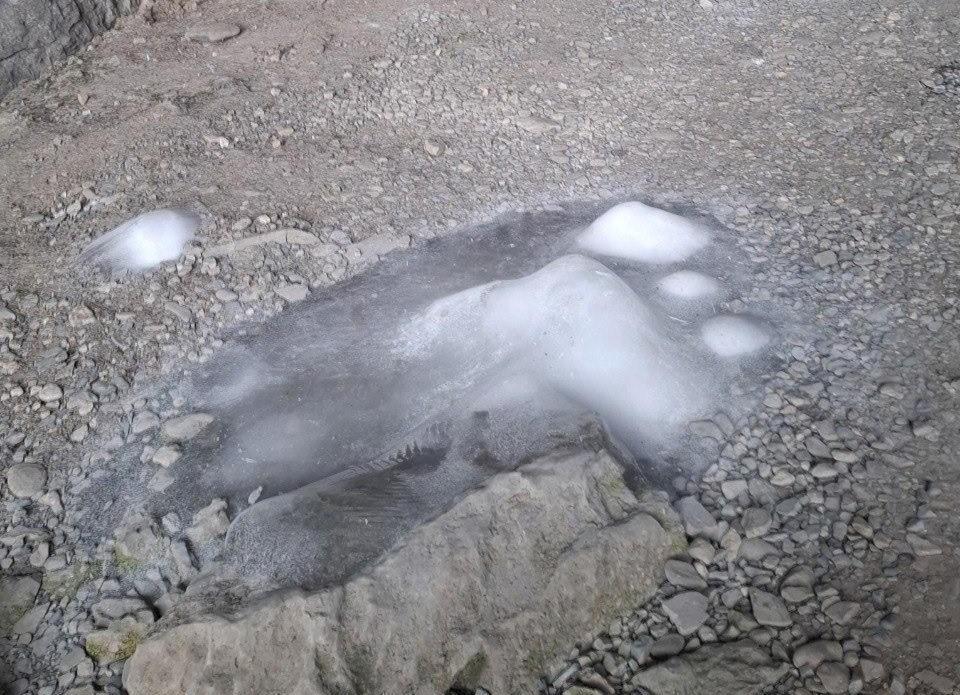 Эксперты-геологи, ознакомившись с фото, считают, что «след» образовался из-за специфических микроклиматических условий. Капли воды, насыщенной минералами, замерзают у входа в пещеру, создавая причудливые ледяные структуры.