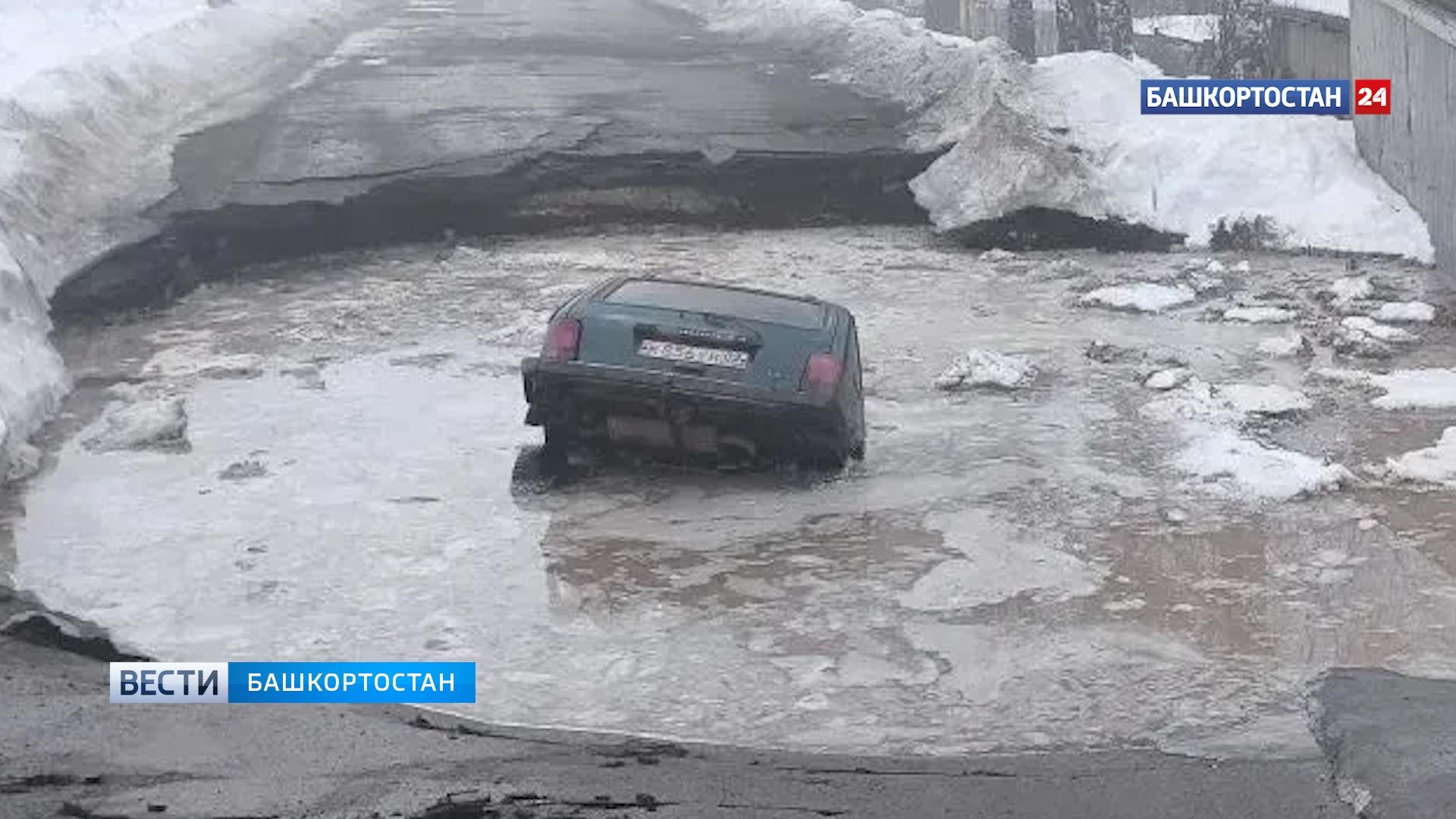 В селе Старобурново Башкирии на дороге образовался карстовый провал, в который упал автомобиль. Водитель успел выбраться и не пострадал.