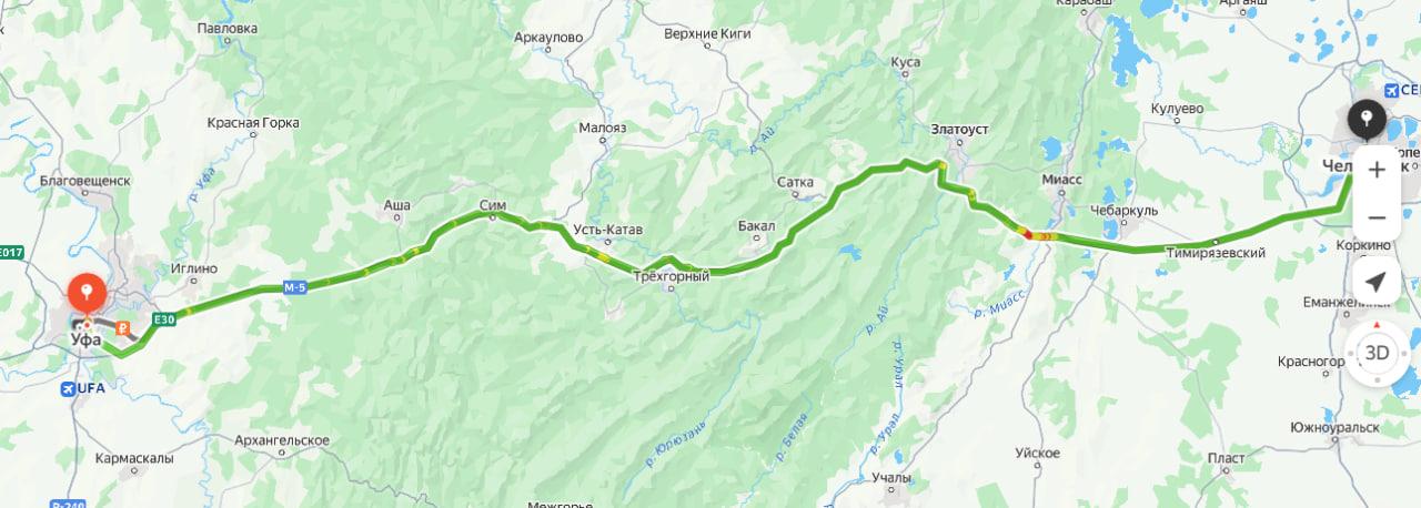 Картографические данные показывают, что на участке трассы, проходящем через Башкирию, движение свободное. Затруднения начинаются позднее — в районе Миасса. По информации ГИБДД Челябинской области, затор произошёл из-за сильного снегопада, а не вследствие аварии.