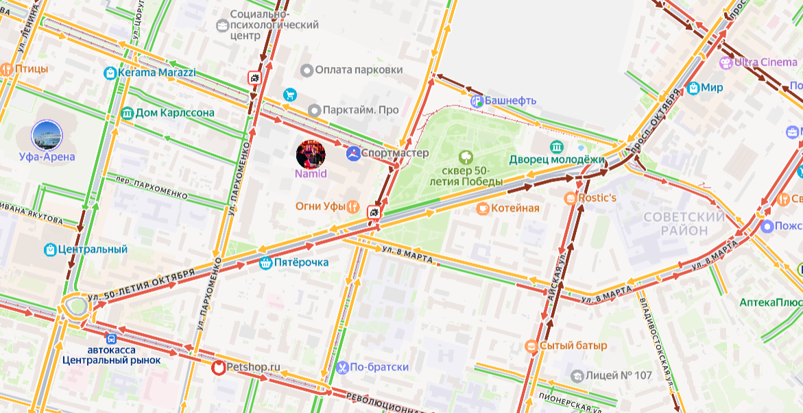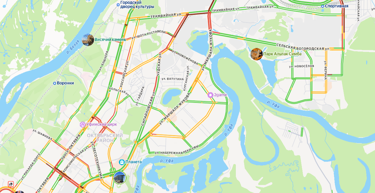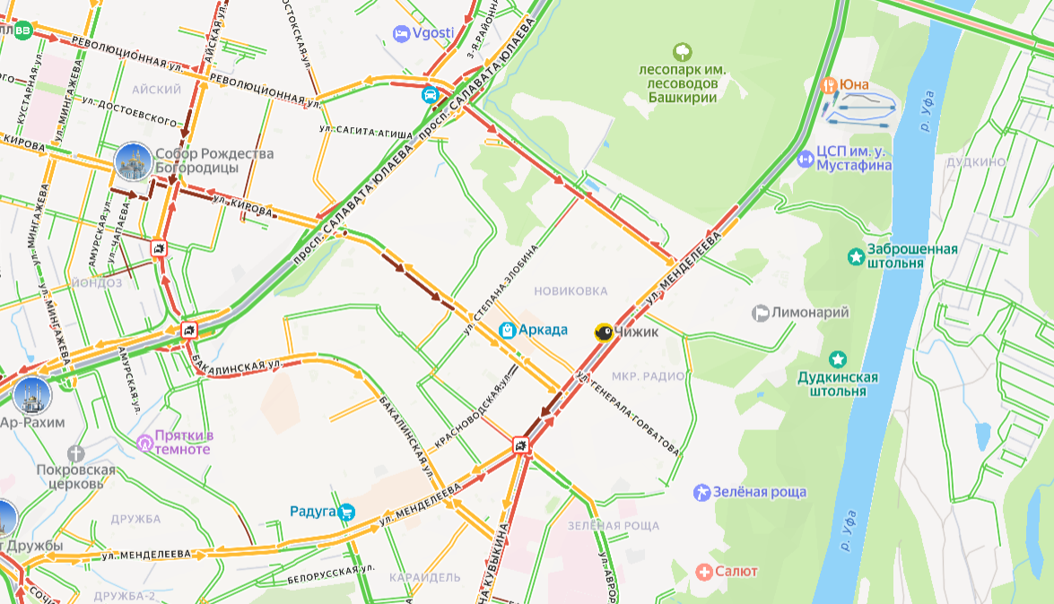 На улице 50 лет СССР, между проспектами Салавата Юлаева и Октября, ситуация также напряженная. В районе Менделеева отмечаются пробки, но менее интенсивные.