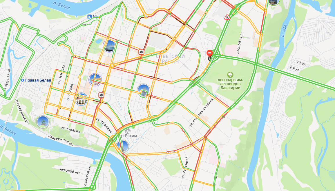 Плотное скопление транспорта наблюдается на проспекте Салавата Юлаева, особенно в районе выезда на Бельский мост. Также образовалась пробка на Сипайловской улице перед въездом в микрорайон Сипайлово.